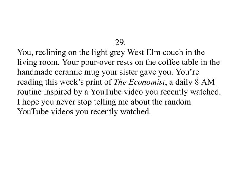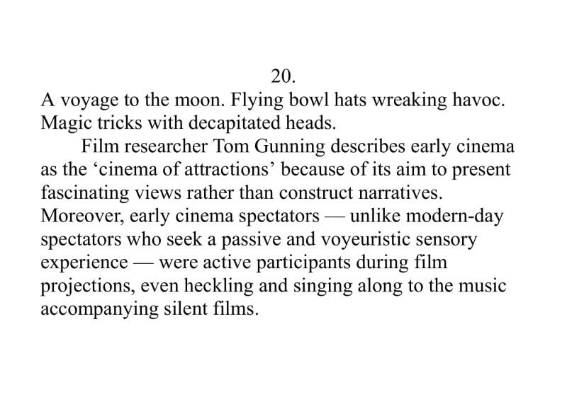 And this was my cue to leave. If I wanted to be the guy who cut it close but in the end bailed, I had to get up right then before Helen showed. There are never any trailers before the main feature. And I was sitting in the dark. I could hear the breaks in the film, the switch of audio levels. The screen kept flicking bright empty projections of no show. My eyes adjusted to having to seize quick sight and I noticed that Helen was sitting to my left, a seat away from me, looking at the same white surface. She couldn’t have been there for much more than a few minutes. She looked at me then pulled up a large tub of popcorn from her lap to offer me some.  I didn’t want to eat unless the main feature was playing. But when was it going to start? This was uncomfortable.