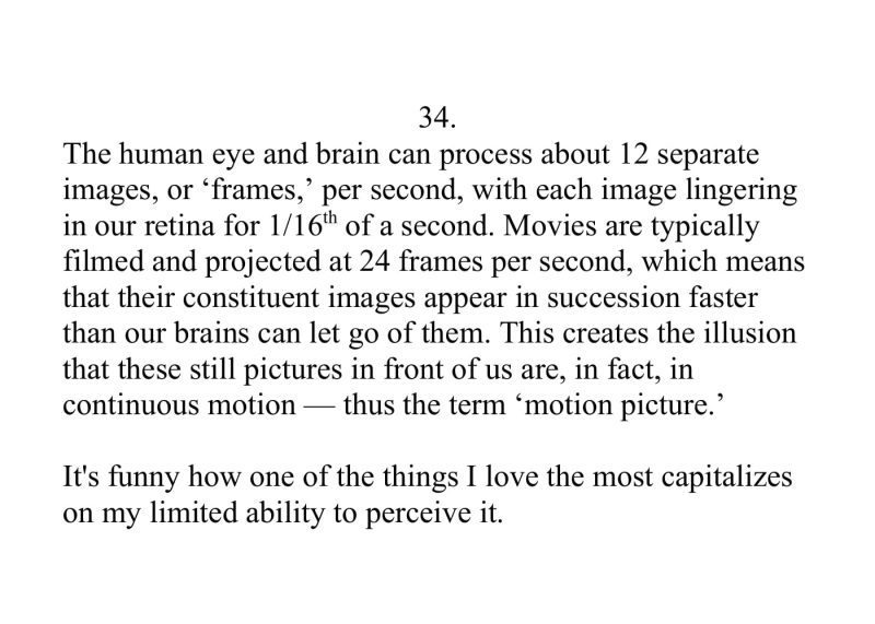 We had shown up. Helen and I had kept up our part of the deal, but the movie hadn’t.  And now: not even the courtesy of erratic flickering, just the integrity of projector light unfiltered by any film. The sharp planes of Helen’s face and the pale lip-skin that detailed her pout had never cooperated so tightly before. She opened her mouth to ask me something, but didn’t say a word, and after a moment let it close.